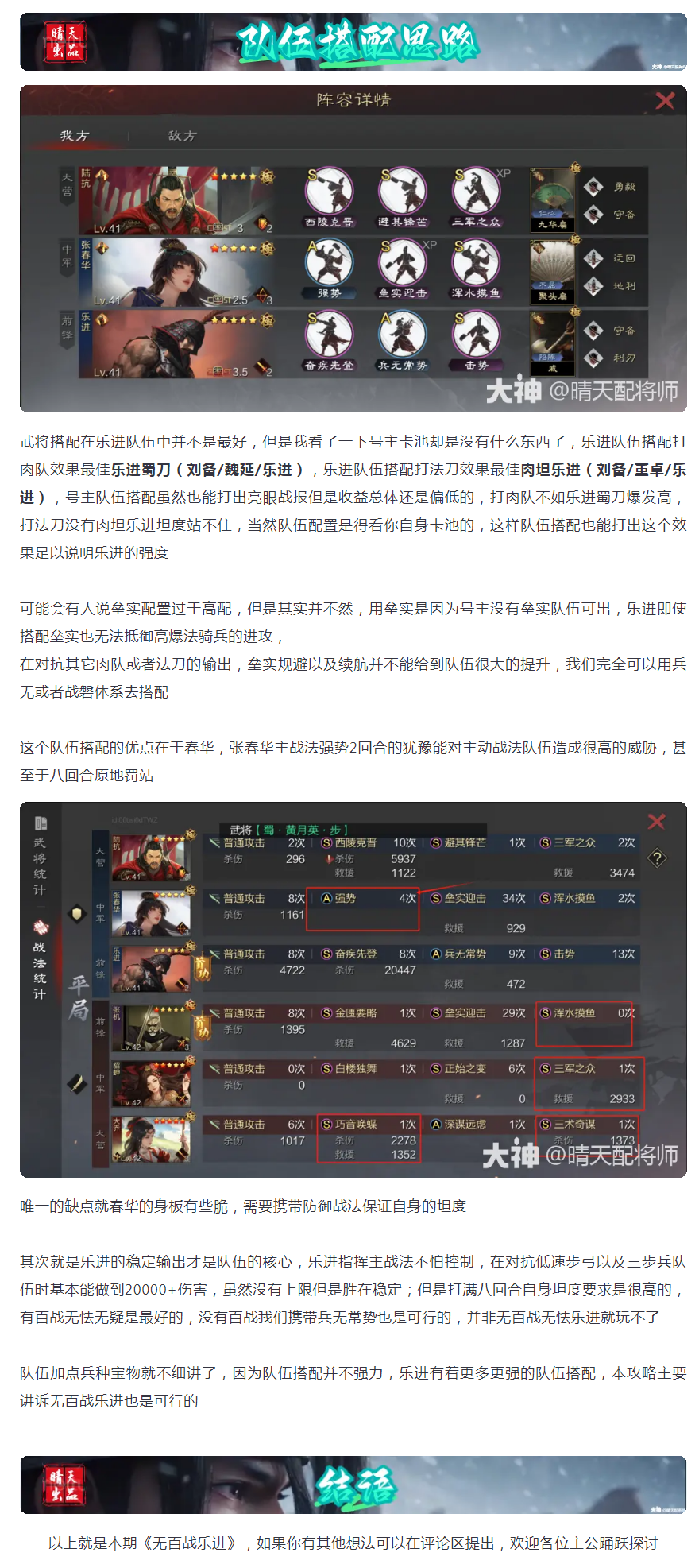 武将搭配在乐进队伍中并不是最好,但是我看了一下号主卡池却是没有什么东西了,乐进队伍搭配打肉队效果最佳乐进蜀刀(刘备/魏延/乐进),乐进队伍搭配打法刀效果最佳肉坦乐进(刘备/董卓/乐进),号主队伍搭配虽然也能打出亮眼战报但是收益总体还是偏低的,打肉队不如乐进蜀刀爆发高,打法刀没有肉坦乐进坦度站不住,当然队伍配置是得看你自身卡池的,这样队伍搭配也能打出这个效果足以说明乐进的强度