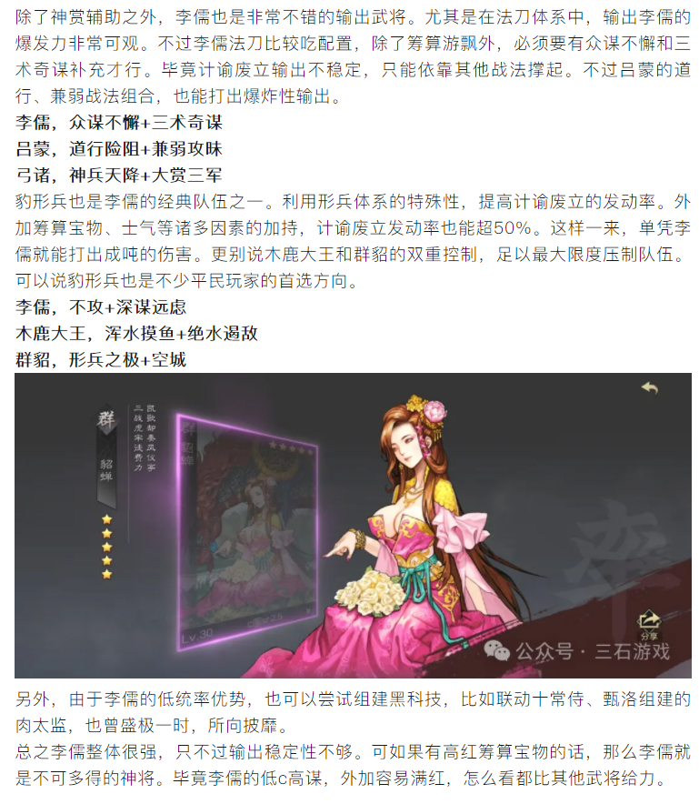 【攻略分享】低c高能的武将,法刀绝佳辅助将,最强李儒队伍推荐