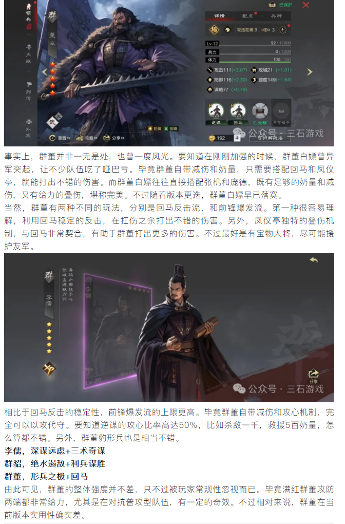 在率土之滨中,群董一直都是比较冷门的武将。虽然有优秀的面板属性,和不错的主战法,可依旧只能沦为材料将。毕竟群董的减伤看似给力,可在无法援护友军的前提下,显得比较鸡肋。即便攻击距离的短板得到弥补,可相比于夏侯惇、典韦等前锋武将,依旧显得比较拉胯。毕竟在当前版本中,垒实前锋、百战前锋是主流,而群董等单纯减伤、回奶的武将,却显得比较尴尬。不过作为人手一个满红的平民武将,群董究竟能不能玩呢?