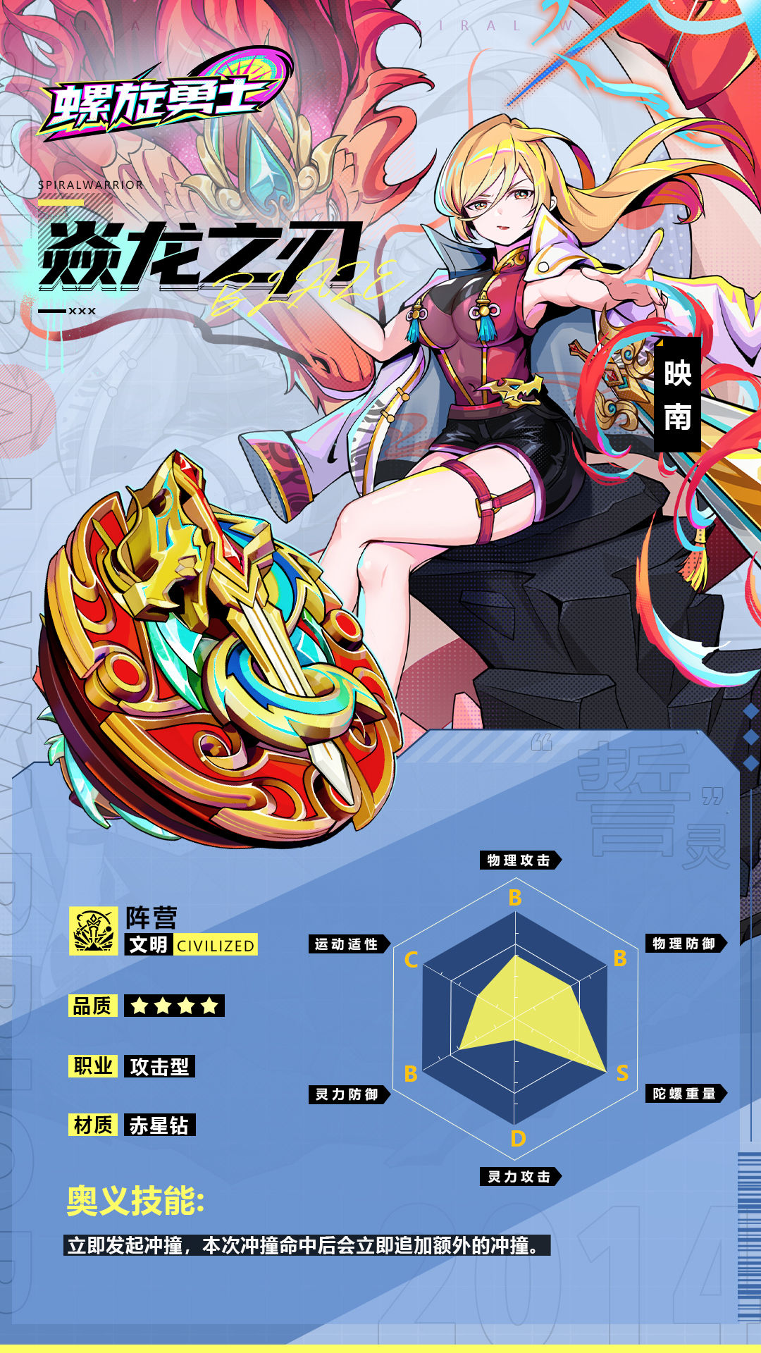 波比战力分析显示,以赤星钻材质打造的“焱龙之刃”陀螺,重量S级,冲撞命中敌方陀螺时会追加额外冲撞。期待此次试炼场能见到一场与焱龙酣畅淋漓的战斗。