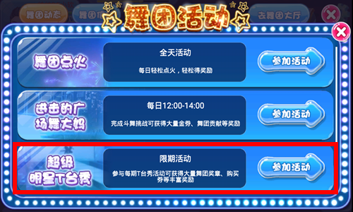 T台秀入口:点击“我的舞团”-“舞团活动”-“舞团T台秀”。