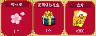 奖励为【花雨绽放礼盒】【樱花瓣】【大量金券】