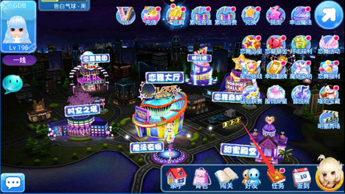 2019年5月22日维护后进入“世界地图”界面,如下图所示,点击右下角小恋头像后,点击弹出菜单中的“任务”按钮,即可在“活动任务”分类中查看并接取“欢乐六一”系列活动。