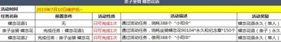 2019年7月10日维护后起,可通过“亲子坐骑,蝶恋花语”系列活动获得新款单人坐骑:蝶恋花语,可通过活动任务升级为亲子坐骑:蝶恋花语(亲子),喜欢的友友们不要错过哦~
