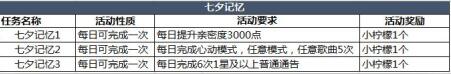 2019年7月31日维护后~8月13日维护前,每日完成“七夕记忆”系列任务即可在任务栏领取“小柠檬”,拥有指定数量的“小柠檬”即可在任务栏兑换小恋送出的七夕精美好礼哦~