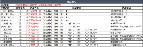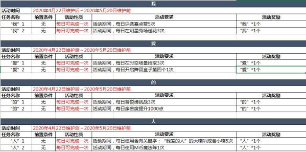 - 完成“我”“爱”“的”“人”系列任务可获得兑换道具“我”“爱”“的”“人”