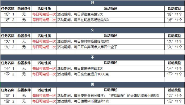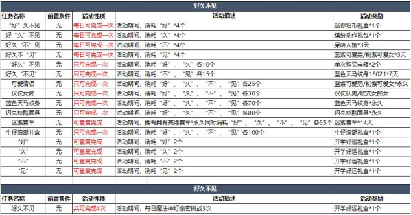- 完成“好”“久”“不”“见”系列任务可获得兑换道具“好”“久”“不”“见”