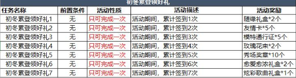 2020年11月18日维护后~12月2日维护前,累计签到次数达到活动要求即可获得对应奖励~