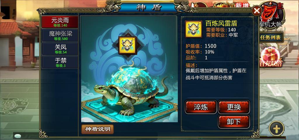 神盾:可用于装备和淬炼,分为多个品阶(等阶越高的神盾伤害吸收率也越高)。