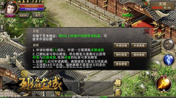 2.求婚一方在商城购买求婚戒指后,对话龙城中的NPC月老,申请结婚。这年头没有结婚戒指也想求婚?