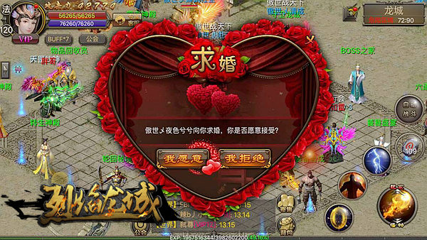 《烈焰龙城》结婚系统区别于其他手游的平淡无奇,为相爱的新人们献上最隆重的结婚仪式,奏响浪漫的婚礼进行曲。当玩家傲世乄夜色兮兮在月老处,拿出求婚戒指向傲世乄素衣浅浅表白求婚成功后,全服通告这个普天同庆的消息,让天下共同见证。玩家们纷纷在世界发出祝福生意,不少女玩家表示被感动到了!相信这一刹那将变为两人永恒的唯美回忆。同时新人还举办盛大结婚宴席,邀请公会兄弟、亲朋好友参与婚宴,洒下喜糖,共同推倒BOSS,一起分享婚礼的乐趣!如此浪漫的婚礼仪式,是上天对有情人爱的祝福,只为夜色兮兮和素衣浅浅收获这段美好的记忆,铭记此刻的龙城时光!