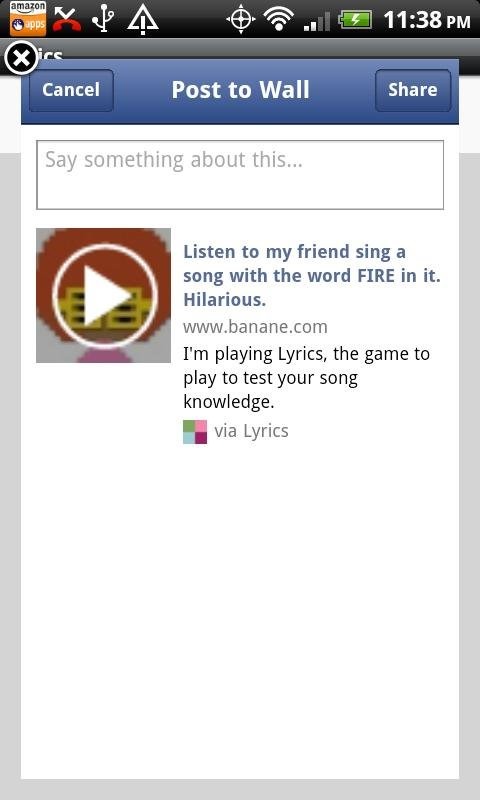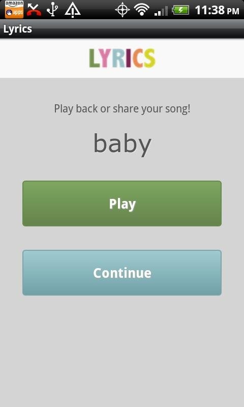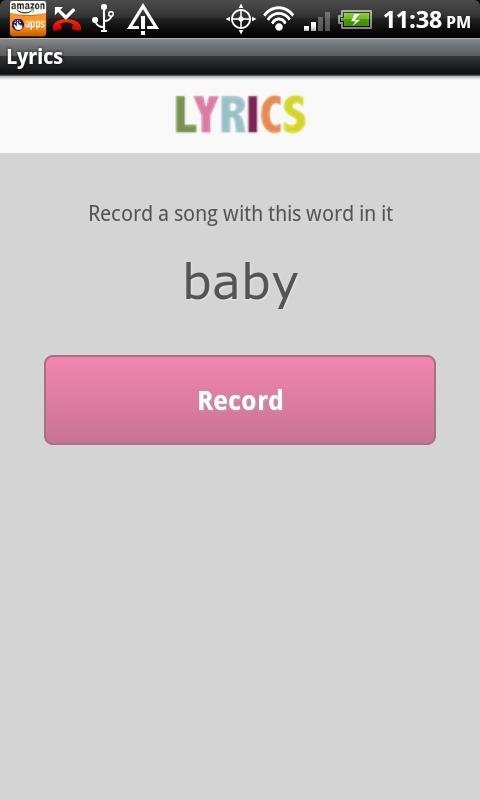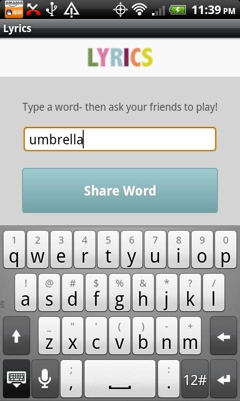 Lyrics, the social mobile game that lets you sing songs with friends. Get a word, think of a song with the word in it and sing it. Share songs with friends on Facebook. Pick words that you want friends to sing and hear the songs they come up with!