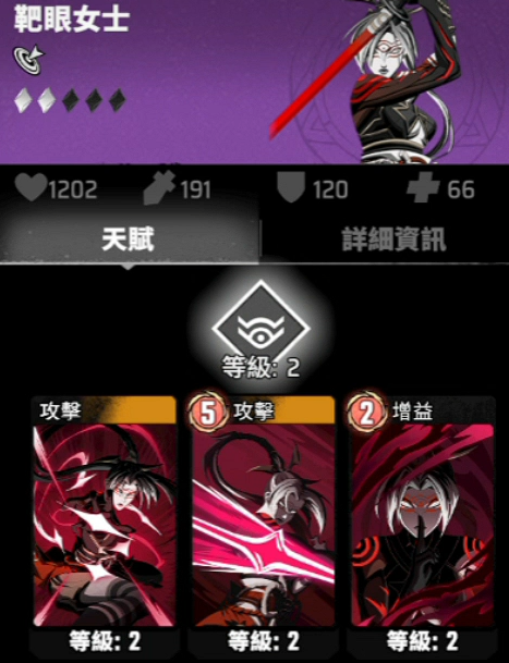 从目前的资料来看,因为游戏测试较少的缘故,所以目前的卡组搭配也不是很多,接下来便为大家来介绍一下当下的一些使用较多的主流阵容。首先第一个介绍的便是追击队。这个队伍的核心角色是靶眼女士,这个角色的获取难度难度很低,大家在通过游戏的第一章之后便可以获取到这个角色了。别看她是一个紫色人物,她自身的属性并不低。她自身的核心能力是她本身的被动。