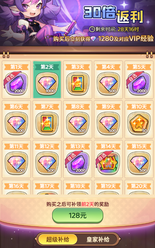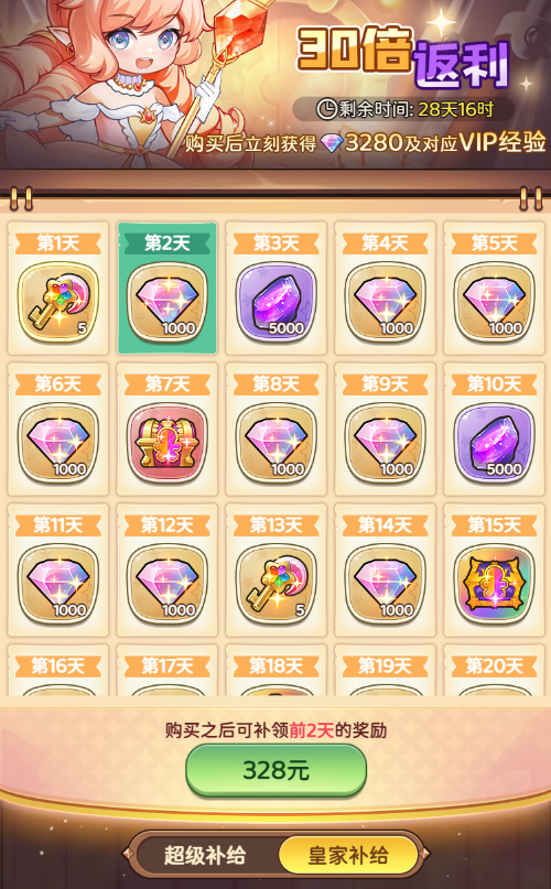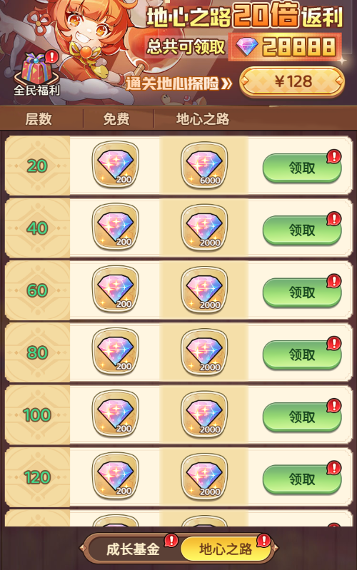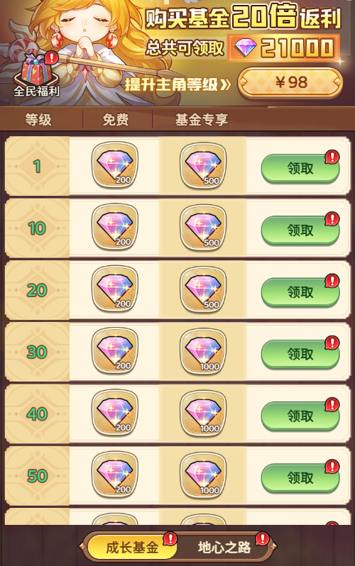 - 投资模式:一次性付费,随着主角等级提升分期领取大量钻石等资源。