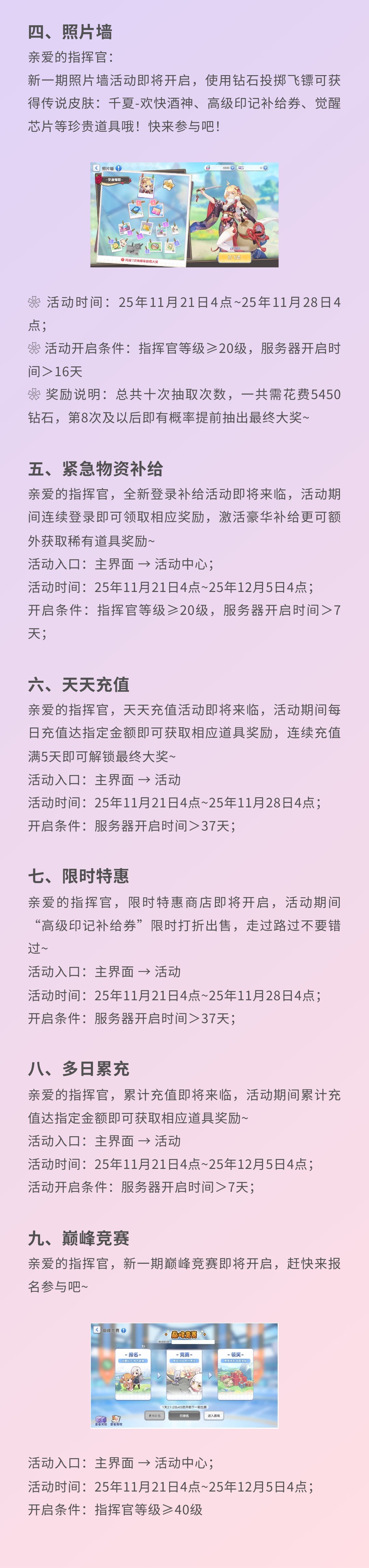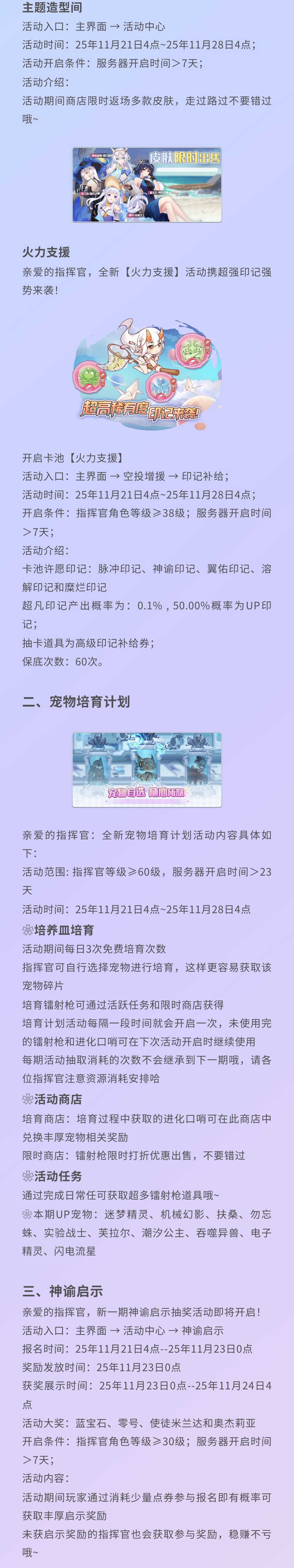 11月21日本周五,奥杰莉亚、使徒米兰达、零号、蓝宝石返场啦,更有适配印记卡池同步返场,各位指挥官们走过路过不要错过哦~