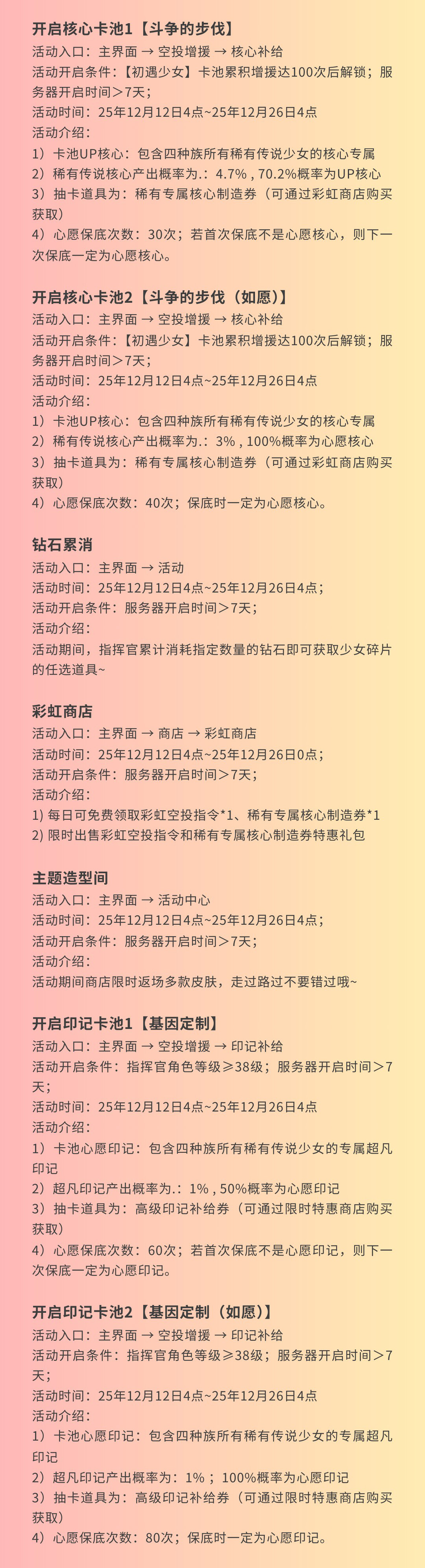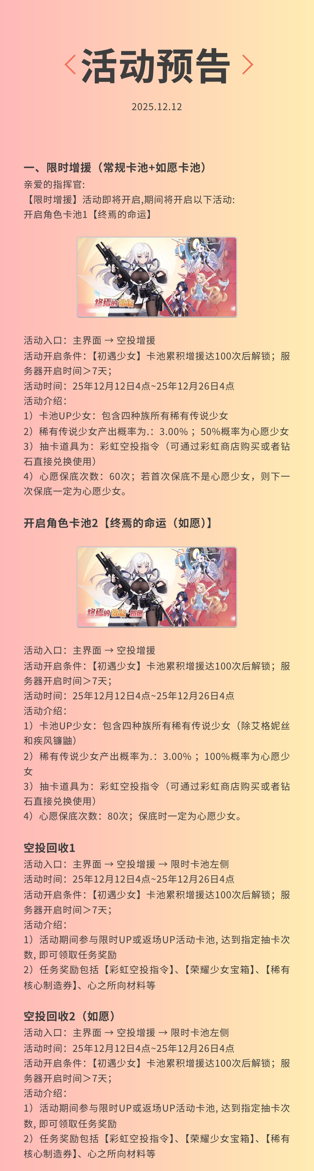 12月12日本周五,四族如愿卡池限时上线,所有四族少女皆能如愿抽取,保底不歪!各位指挥官,走过路过不要错过!