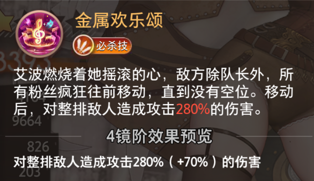 艾波燃烧着她摇滚的心,敌方除队长外,所有粉丝疯狂往前移动,直到没有空位。移动后,对整排敌人造成攻击280%的伤害。