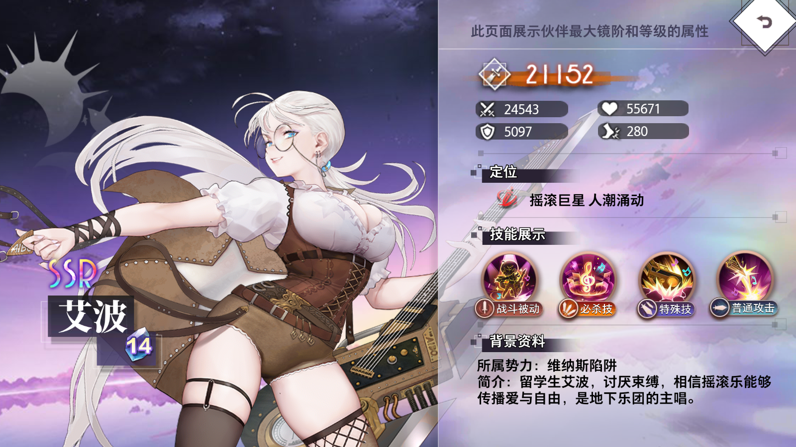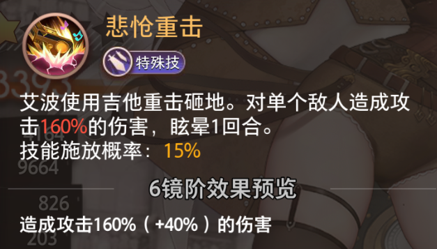 艾波使用吉他重击砸地。对单个敌人造成攻击160%的伤害,眩晕1回合。