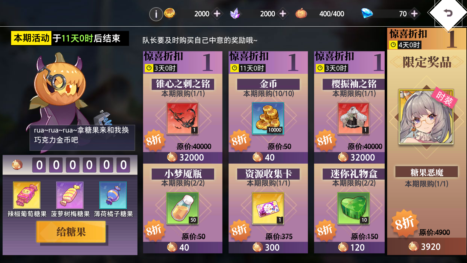 在活动期间可以获得三种糖果,糖果可在梦魇交易所兑换巧克力金币,巧克力金币可用于购买奖励。梦魇交易所内可购买UR装备-锥心之刺之铭、樱振袖之铭、限定时装:丽姬娅-糖果恶魔。梦魇交易所内可购买的物品同步上线限时折扣福利~其中部分物品的折扣力度将随活动天数动态调整,建议您每日关注交易所,及时获取心仪道具的最优购买时机哟!