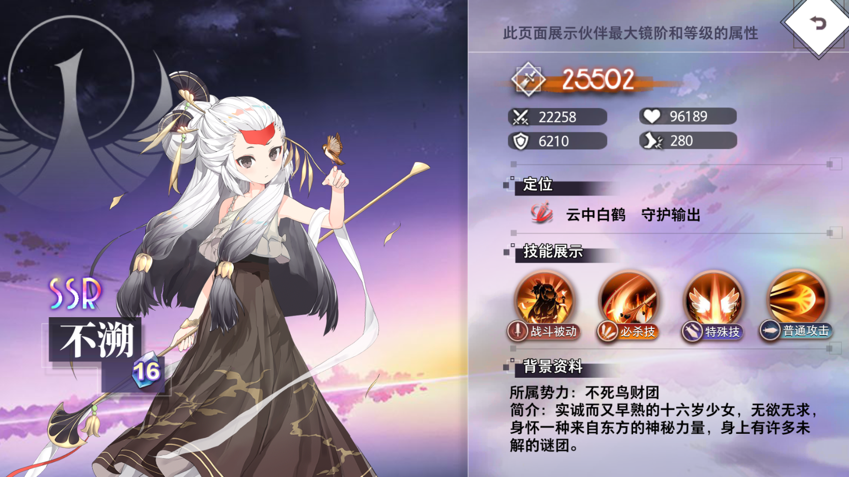 不溯吸收天地之灵气,登场时,使身后一格的伙伴回复500点怒气。