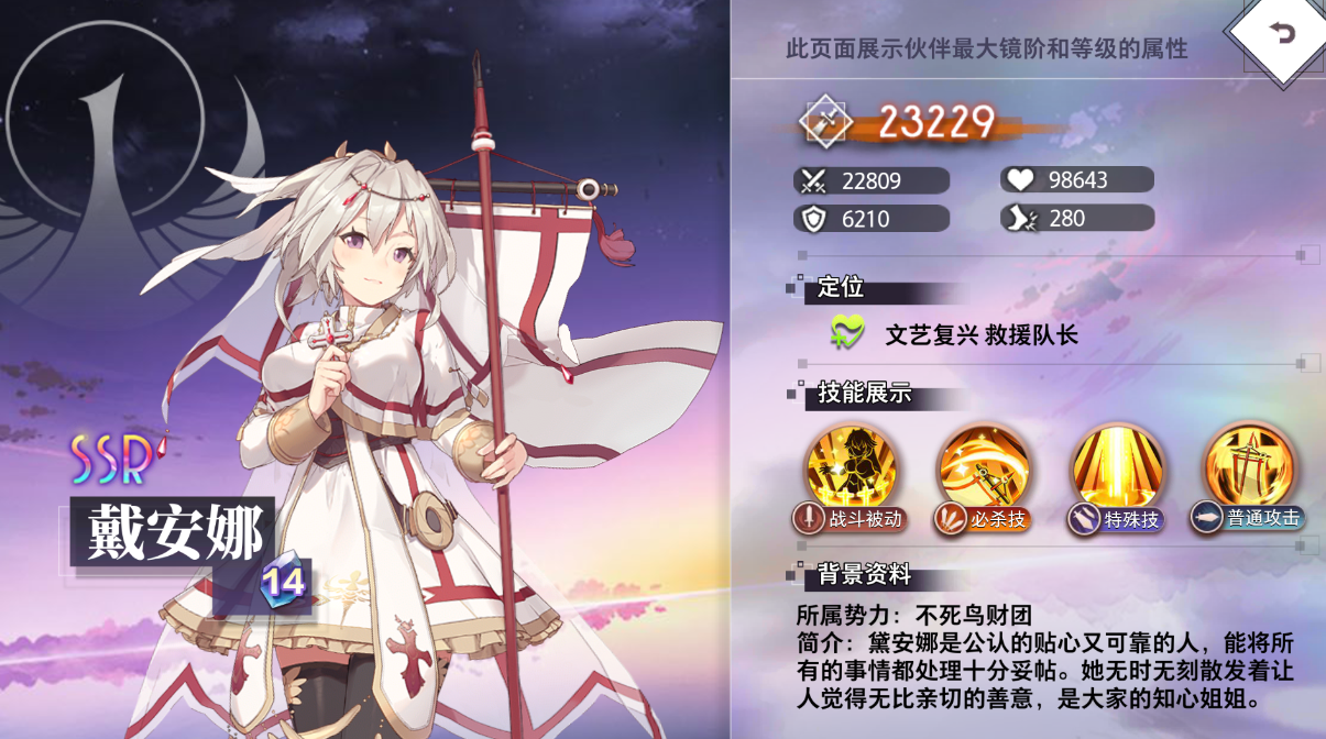 高举誓约之旗,圣光照耀战场,戴安娜对单个敌方单位造成攻击285%的伤害,使生命比例最低的己方伙伴,恢复全部生命。