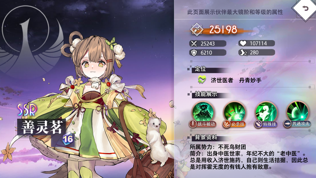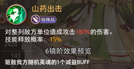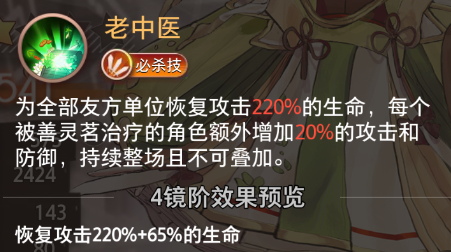为全部友方单位恢复攻击220%的生命,每个被善灵茗治疗的角色额外增加20%的攻击和防御,持续整场且不可叠加。