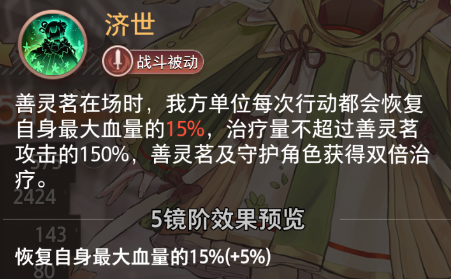 善灵茗在场时,我方单位每次行动都会恢复自身最大血量的15%,治疗量不超过善灵茗