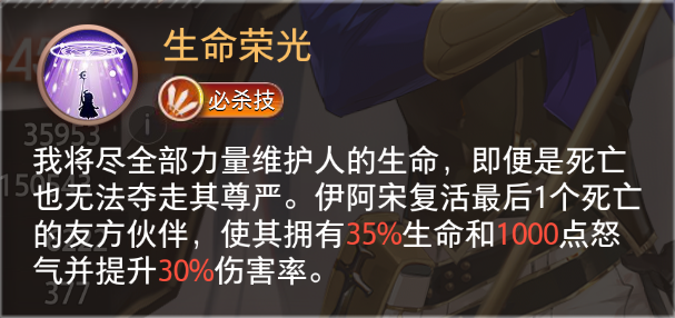 我将尽全部力量维护人的生命,即便是死亡也无法夺走其尊严。伊阿宋复活最后1个死亡的友方伙伴,使其拥有35%生命和1000点怒气并提升30%伤害率。