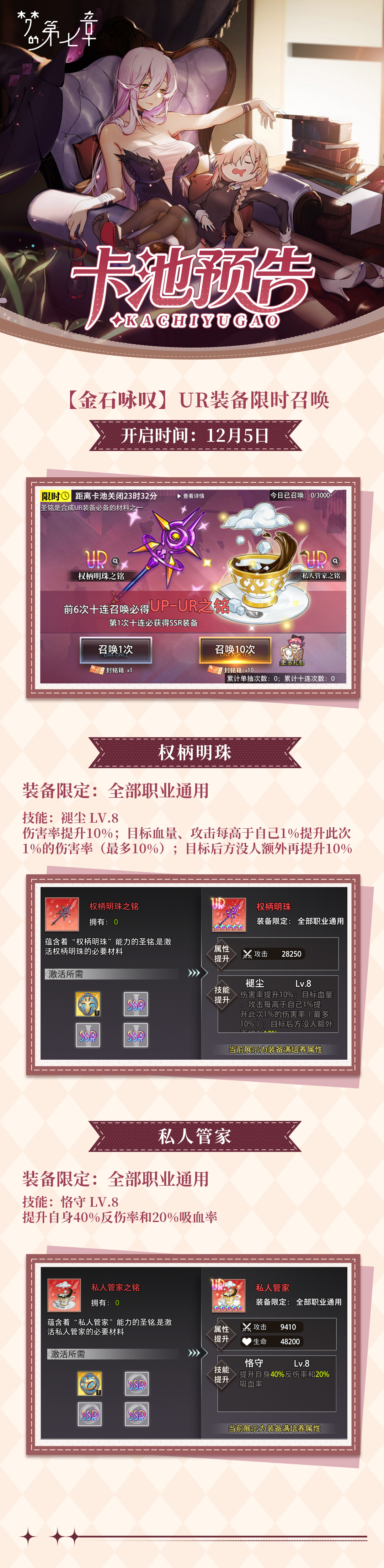 手机游戏> 梦的第七章> 游戏新闻> 金石咏叹 权柄明珠&私人管家 UR装备限时召唤