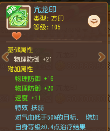 这枚扶弱龙印可谓是极品中的极品!未强化状态下就已经提供了57点物理防御以及11点速度属性加成了。强化后的93点物防、22点速度总属性更为惊人!再加上“扶弱”特效带来的整体治疗量加成,可令治疗门派化身妙手回春、刀枪不入的钢板“奶爸奶妈”,救全体队友于水深火热之中,给予大家满满的“安全感”!