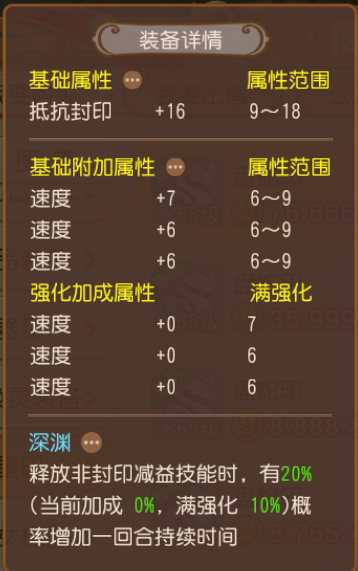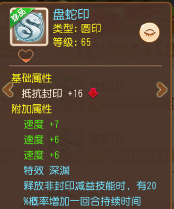 “深渊”特效能概率提升“毒”、“六道轮回”、“锁魂判官”、“断肠蛊”、“黯然销魂”等非封印减益技能的持续回合,大幅提升地府、盘丝少侠们的辅助进攻和持续消耗能力;“抵抗封印”的基础属性能降低被封印门派控制的概率,减少干扰;齐刷刷3条速度属性更是实用!
