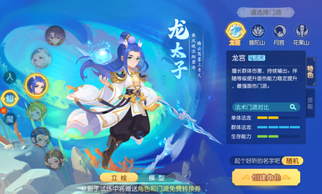 “龙宫”作为目前热门法系门派,因其超大范围群体法术攻击技能“龙卷雨击”在5V5战斗中相当强势,深受广大少侠青睐。