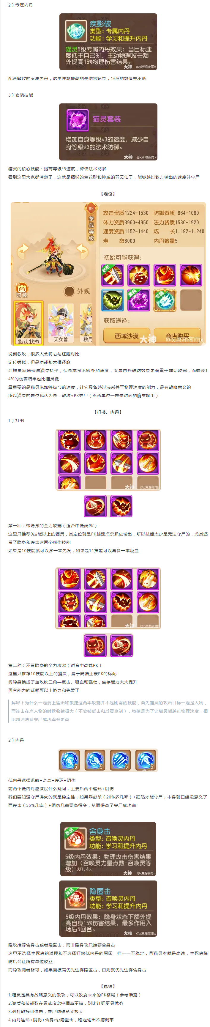 猫灵是具有战略意义的敏攻,可以改变未来的PK格局(参考瞬宠),资质和技能数在勇武攻宠中相当不错,对比红鲤更具优势,必打敏捷和连击,守尸物理意义极大,内丹连环+阴伤+舍身击/隐匿击,稳定输出不搏概率。