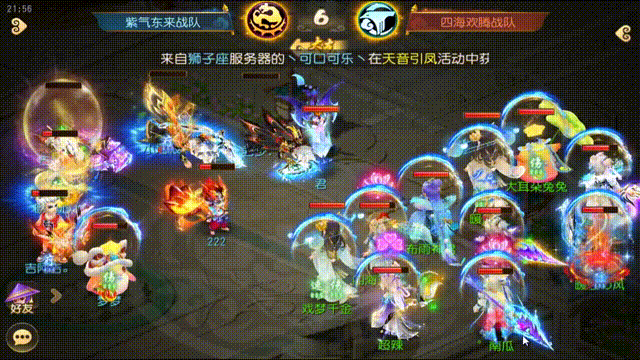 第5回合,四海欢腾战队盘丝补出光明火拿下双杀,大唐横扫出手,对战方地府虽有苍白纸人附加状态,无奈血量较低,大唐横扫千军完成击杀。