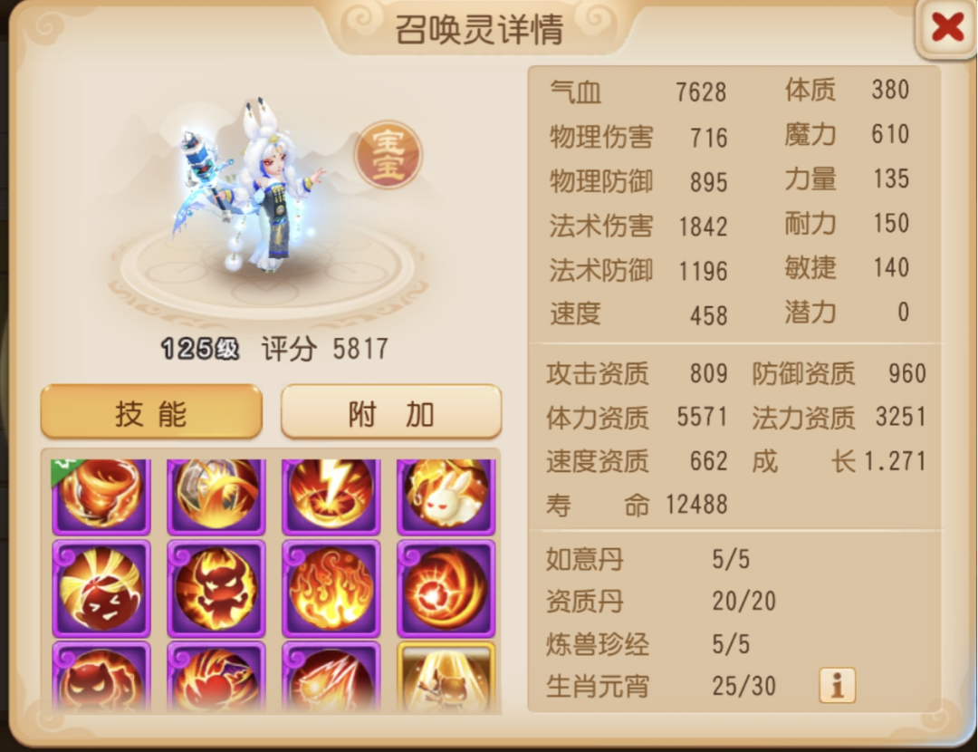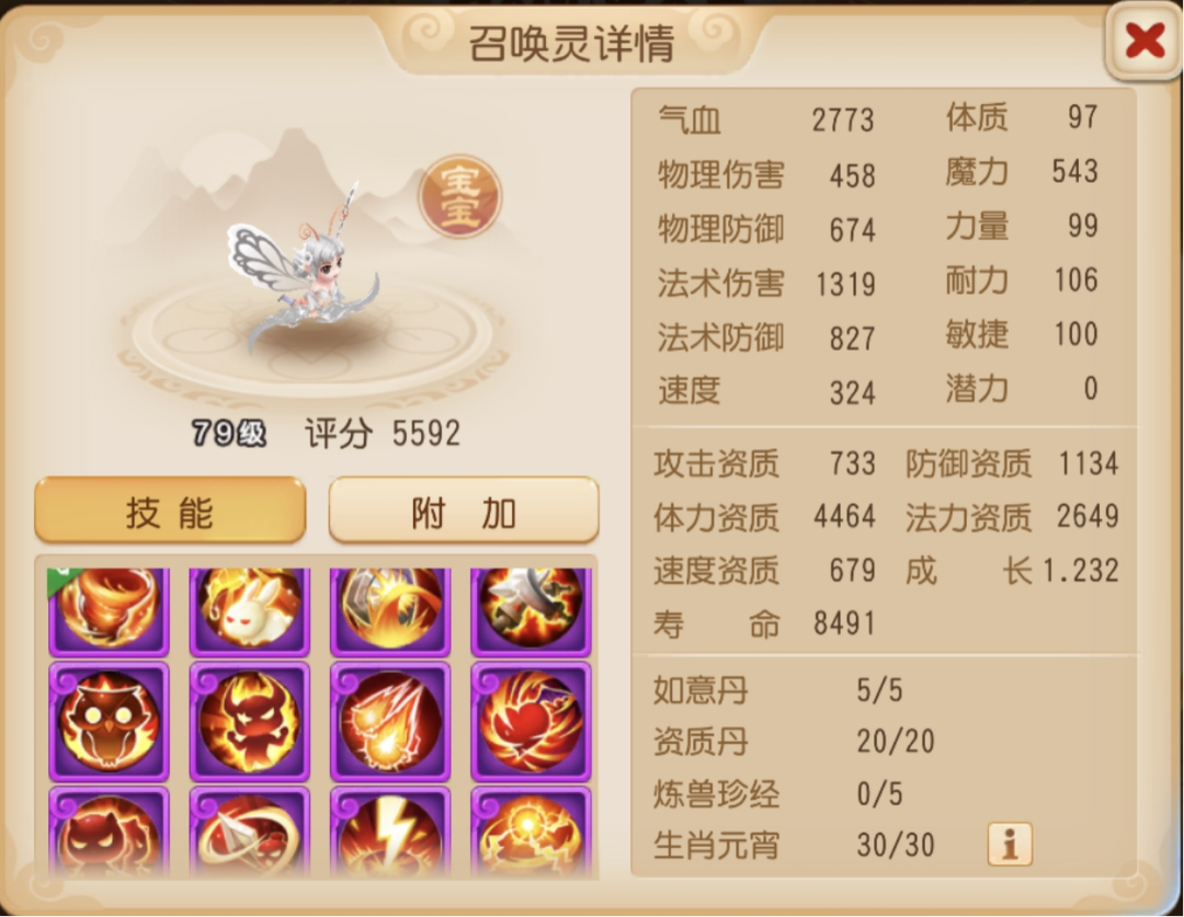 除了水无常形这一核心技能外,这只蝴蝶仙子还拥有高级魔之心、高级法术暴击等强力增益技能,资质成长也相当饱满,若是再搭配上如梦如幻的“花舞晴空”,每一次出手都犹如翩翩起舞的精灵,美丽而致命!