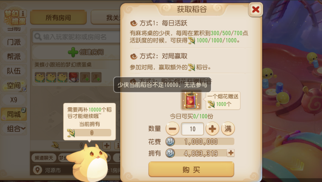 方式3:购买烟花获赠稻谷。一个烟花赠送1000个稻谷,购买10个就可以获得10000稻谷参与掼蛋玩法。