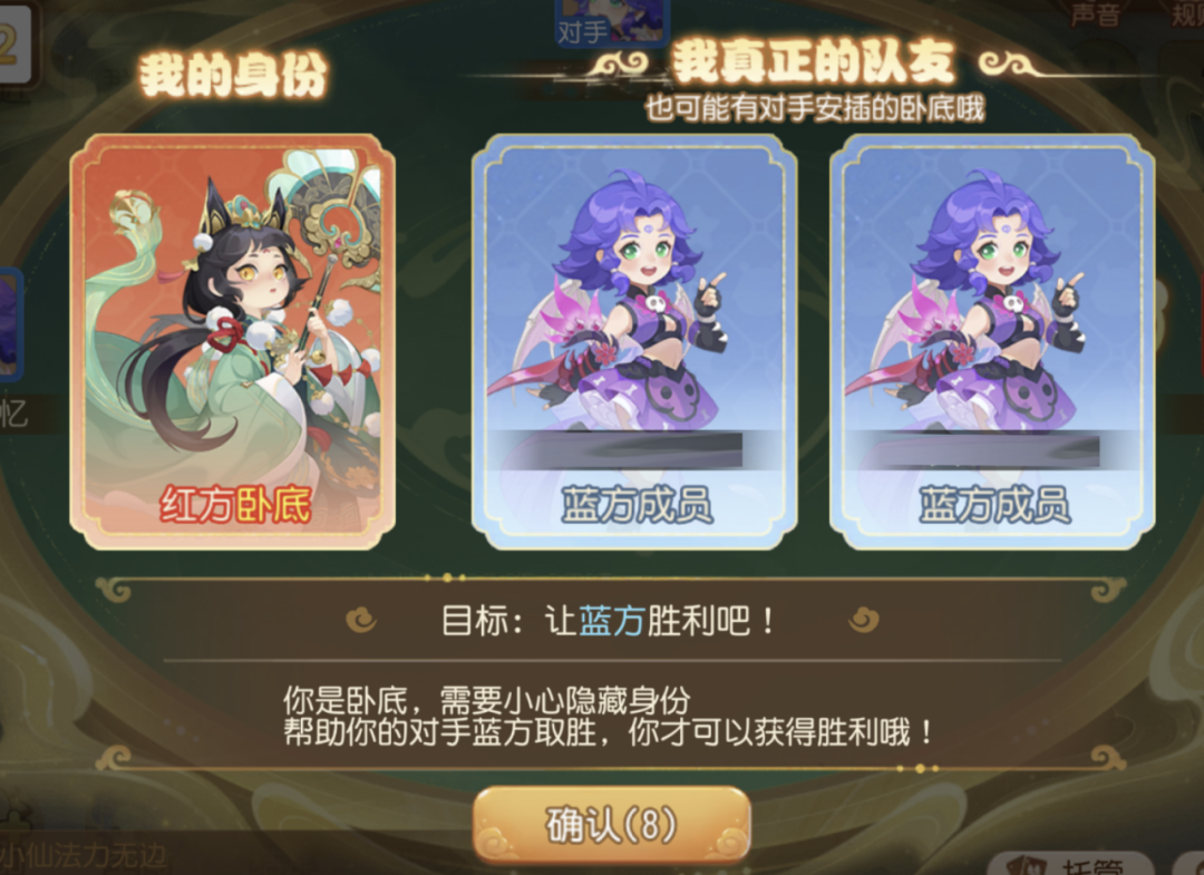 你是卧底,你需要和你的卧底队友共同取胜!少侠要注意隐藏自己的身份并让队伍获得第一名哦~