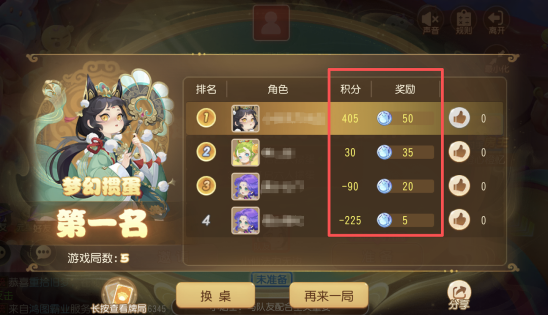 牌桌结算会计算个人在对局中累计获得的队伍积分,根据积分排名获得咕噜币,积分越高咕噜币越多。每周在掼蛋区获取的咕噜币最多不超过500。