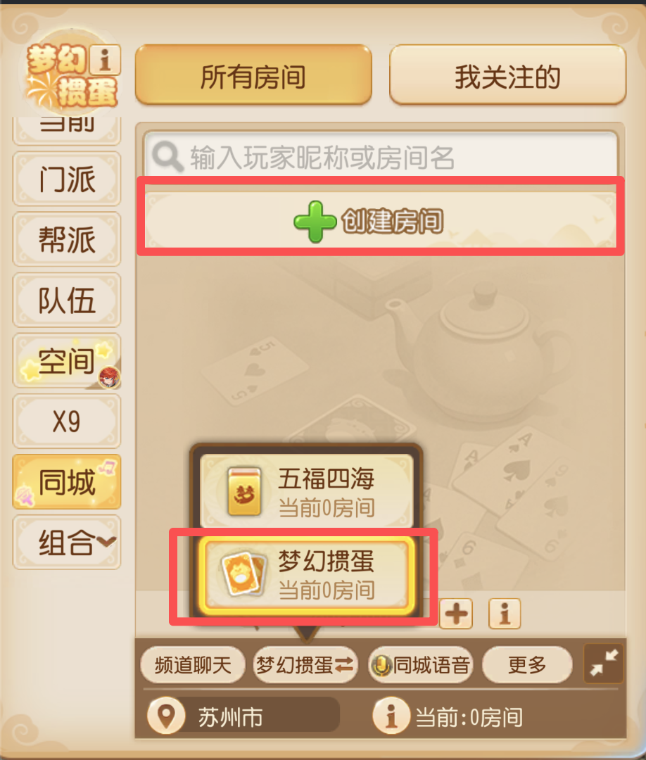 少侠也可以点击同城频道,点击同城玩法,快速创建房间:
