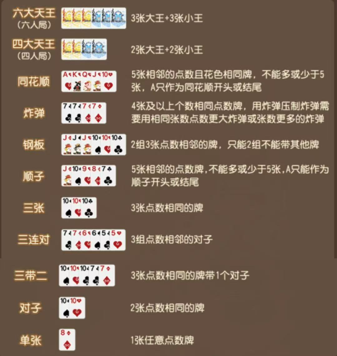 队伍合作,头游(第一名)获胜。即,自己或队友最先出完手牌,取得头游才算获胜(获胜队伍名次越高,赢的越多)。