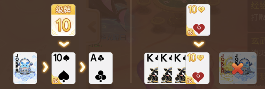 级牌:发牌前随机抽取级牌(级牌是除大/小王之外最大的点数)。
