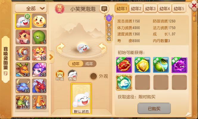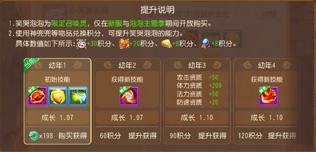 幼年期的笑哭泡泡可通过神兜兜、宝石锤、金刚石、定魂珠培养提升,每提升至下一阶段都会增加资质和成长。