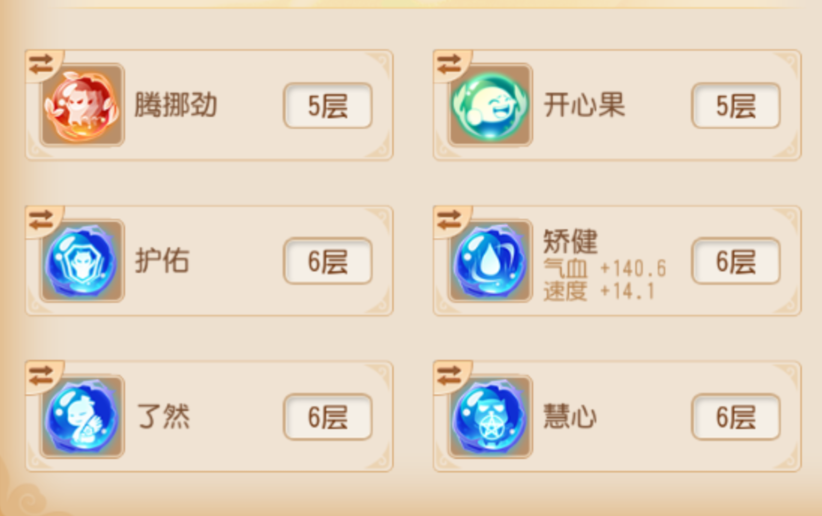 前2个技能推荐配置“高级神佑复生”“高级强壮”;最后1个技能可以选择“高级神迹”,让笑哭泡泡免疫一切可净化的异常状态,免受六道轮回降防、灼炎灼烧等负面效果影响,确保自身不会因为被封印而开不出“嘿打不着”,从而大幅提高生存能力。