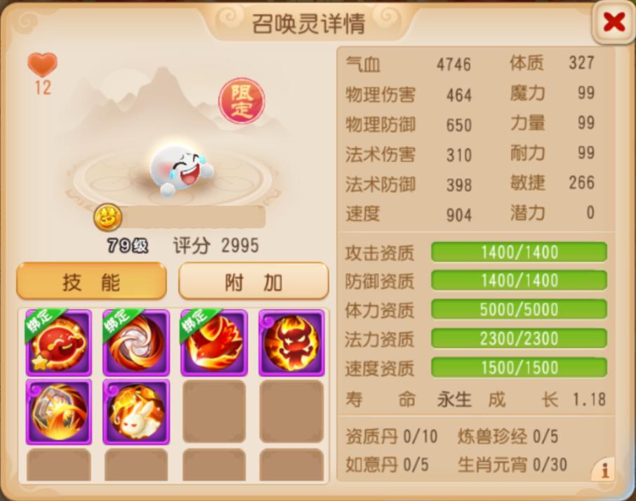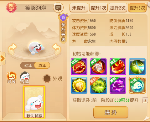 笑哭泡泡在成年后还可提升3次,最高可达到1.3成长,资质分布与配速神兽“超级神兔”一致。
