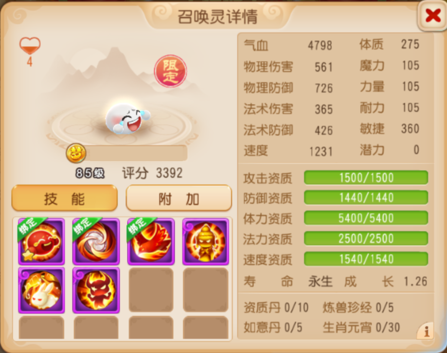 内丹方面,高级内丹建议选择腾挪劲,补足其物理抗性;低级内丹选择矫健、了然、护佑、慧心,综合提升气血、速度,给主人提供抵抗封印和法术伤害结果减免。