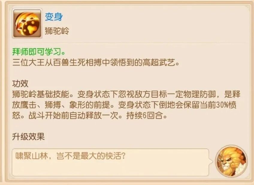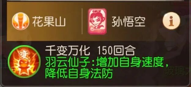 花果山门派特有的“千变万化”机制,令其非常适合作为战场先锋。可选择提升速度的“千变万化”变身卡越速压制敌方三速奶和输出单位。