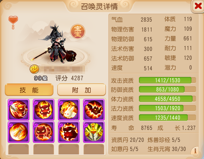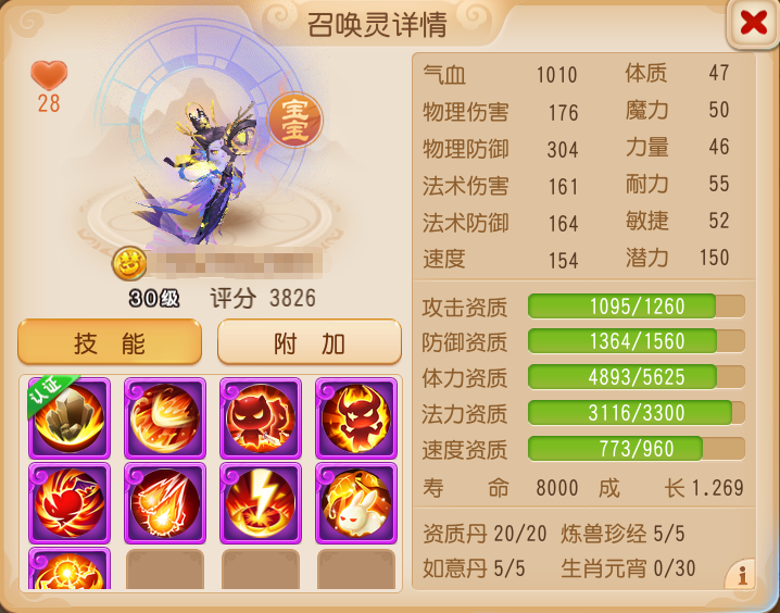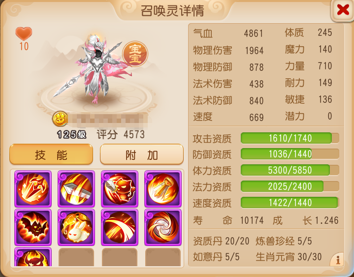 这只玄英夫人可以说是完美的认证9技能法追召唤灵,不仅携带了法系召唤灵必备的高级法术连击、高级法术暴击、高级魔之心,高级会心、高级协力增加输出还有特殊技能“法术追击”大大增加其上限。
