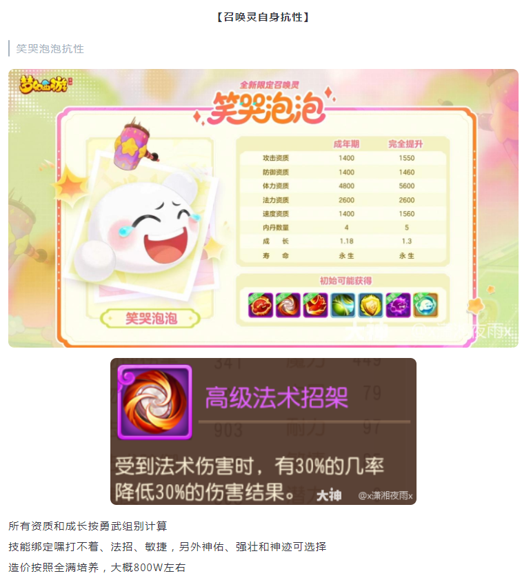 全新限定召唤灵“笑哭"泡泡已经揭晓,定位为首发血宠,其特性为闪避+回血,和勇武的配速法防御风极其相似,这篇文章就从召唤灵自身抗性和提供人物抗性两方面进行对比和分析。