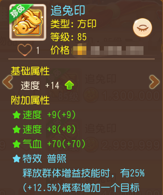 这枚追兔印,基础属性及附加属性都点在了辅助门派刚需的速度和气血上,一方面保障携带者的出手速度,一方面又增强身板,还有普照提升群体增益效果。这是不是辅助少侠的梦中情印呀~