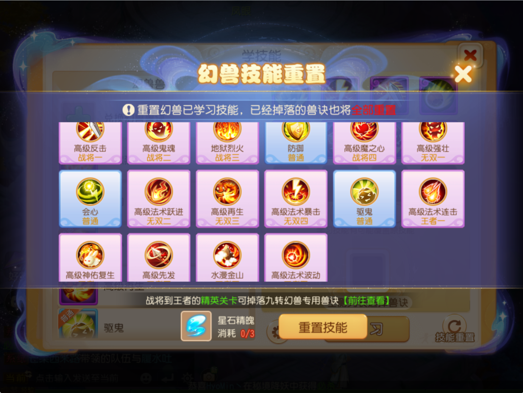 如果对幻兽打书结果不满意或是需要做出调整,也可消耗精魄重置幻兽技能,已经掉落的兽诀也将全部重置。